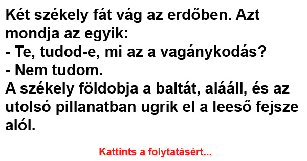 Két székely fát vág az erdőben. Azt mondja az egyik: – Te, tudod-e, mi az a vagánykodás? – Nem tudom. A székely földobja a baltát,…