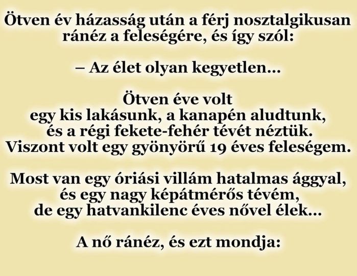 Ötven év házasság után a férj nosztalgikusan ránéz a feleségére, és így szól: – Az élet olyan kegyetlen… Ötven éve volt egy kis lakásunk, a…