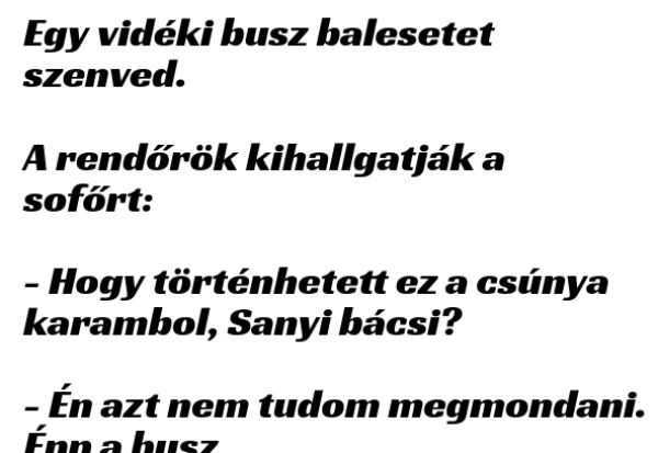 Egy vidéki busz balesetet szenved. A rendőrök kihallgatják a sofőrt: – Hogy történhetett ez a csúnya karambol, Sanyi bácsi? – Én azt nem tudom megmondani.…