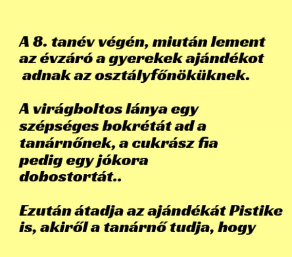 A 8. tanév végén, miután lement az évzáró a gyerekek ajándékot adnak az osztályfőnöküknek. A virágboltos lánya egy szépséges bokrétát ad a tanárnőnek, a cukrász…