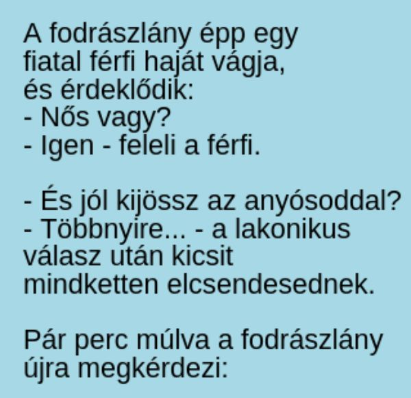 A fodrászlány épp egy fiatal férfi haját vágja, és érdeklődik: – Nős vagy? – Igen – feleli a férfi. – És jól kijössz az anyósoddal?…