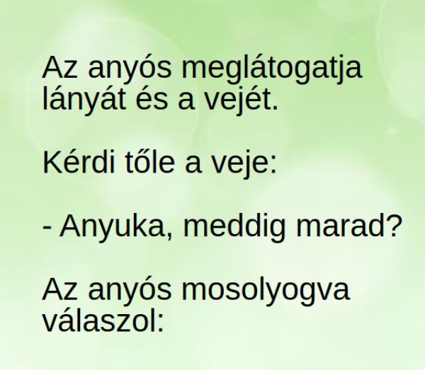 Az anyós meglátogatja lányát és a vejét. Kérdi tőle a veje: – Anyuka, meddig marad? Az anyós mosolyogva válaszol: – Ameddig csak szívesen láttok. Mire…