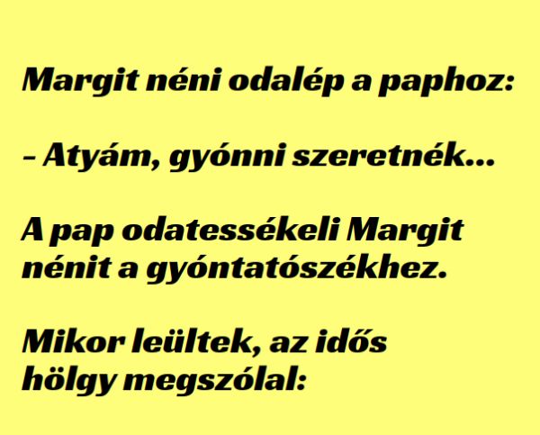 Margit néni odalép a paphoz: – Atyám, gyónni szeretnék… A pap odatessékeli Margit nénit a gyóntatószékhez. Mikor leültek, az idős hölgy megszólal: – Plébános úr,…