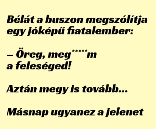 Bélát a buszon megszólítja egy jóképű fiatalember: – Öreg, megdugtam a feleséged! Aztán megy is tovább… Másnap ugyanez a jelenet megismétlődik. Béla este elmeséli a…