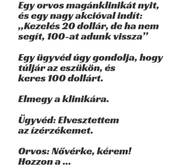 Egy orvos magánklinikát nyit, és egy nagy akcióval indít: „Kezelés 20 dollár, de ha nem segít, 100-at adunk vissza” Egy ügyvéd úgy gondolja, hogy túljár…