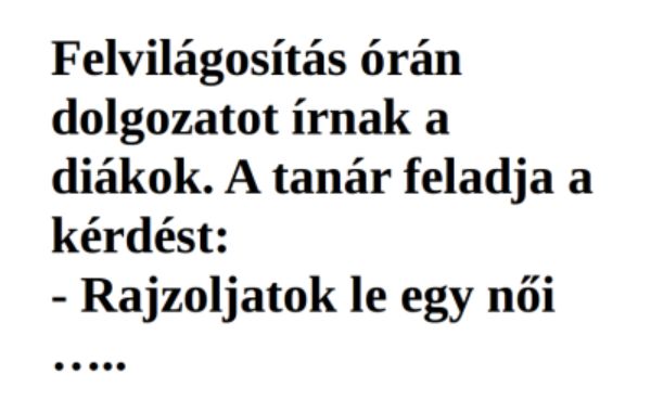 Felvilágosítás órán a tanár dolgozatot írat a tanulókkal. Le is diktálja az első kérdést: – Rajzoljátok le a lapra a női n*mi sz*rvet! Egy szégyenlős…