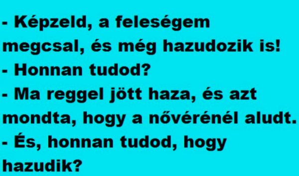 Két férfi beszélget. Az egyik felzaklatva meséli a másiknak: A feleségem nemcsak megcsal, de még hazudik is, és azt hiszi, hogy én beveszem! Miből gondolod?…
