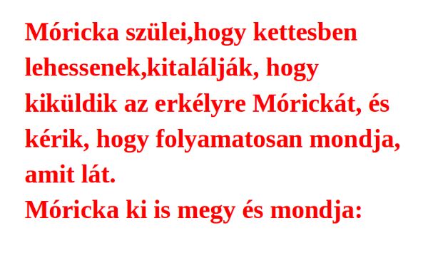 Móricka szülei annak érdekében, hogy akadálytalanul együtt lehessenek, kiküldik Mórickát az erkélyre, és arra kérik, hogy szünet nélkül számoljon be arról, amit kint lát. Móricka…