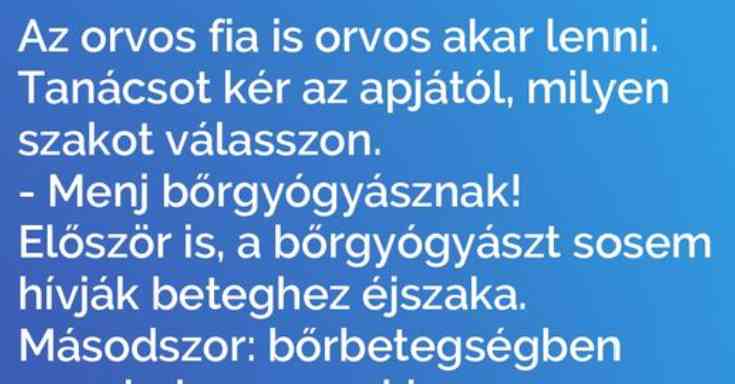 Az orvos fia is orvos akar lenni. Tanácsot kér az apjától, milyen szakot válasszon. – Menj bőrgyógyásznak! Először is: a bőrgyógyászt sosem hívják beteghez éjszaka.…