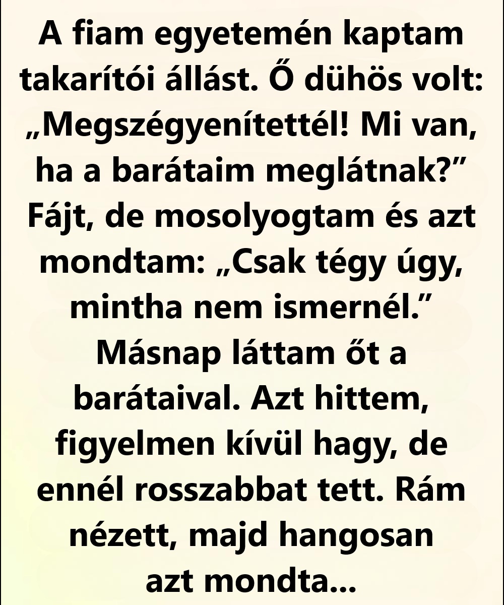 Marissa vagyok, negyvenkilenc éves. A múlt hónapban kezdtem dolgozni takarítóként azon az egyetemen, ahol a fiam, Logan másodéves. A legtöbb évben egyedül neveltem. Volt idő,…