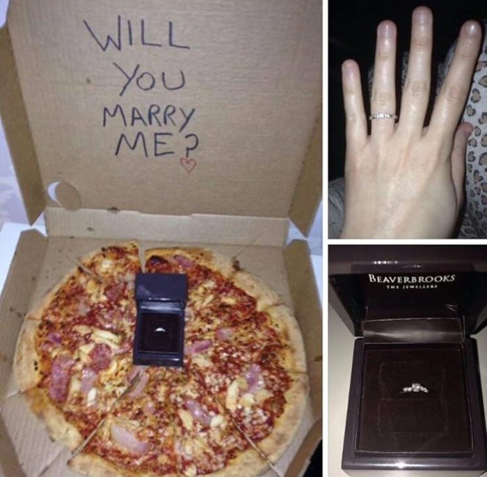 (7) Két legyet egy csapásra: a fickó a lánykérést és a vacsit is letudta egyben. Mégis ki tudna nemet mondani egy pizzára? Hiszen a pizza egy egész életre szóló szerelem.