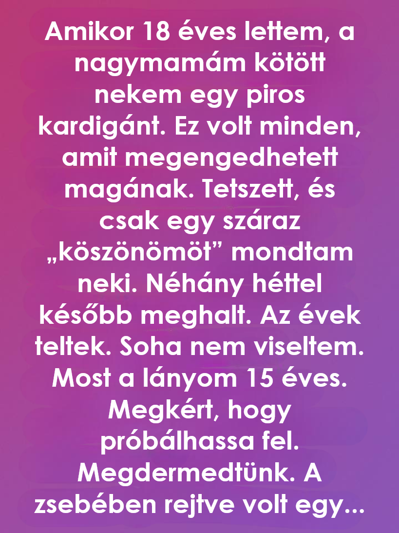 Amikor 18 lettem, a nagymamám egy piros kardigánt adott. Kézzel kötötte, egyszerű volt, nem drága. Mosolyogtam, és csak annyit mondtam, köszönöm. Néhány héttel később meghalt.…