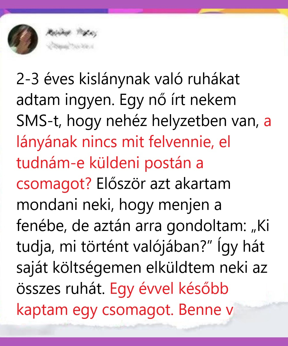 Tavaly, amikor eltettem a kislányom kis ruháit és ingyen felraktam a netre, csak a rendet akartam helyrehozni. Egy Nura nevű nő írt, hogy szűkösen élnek,…