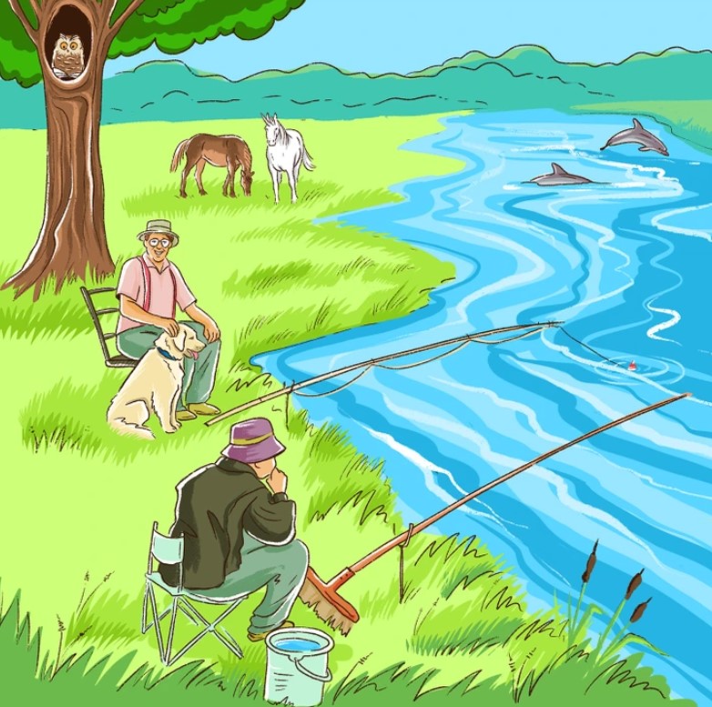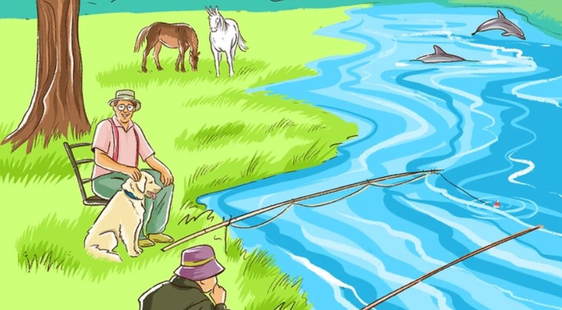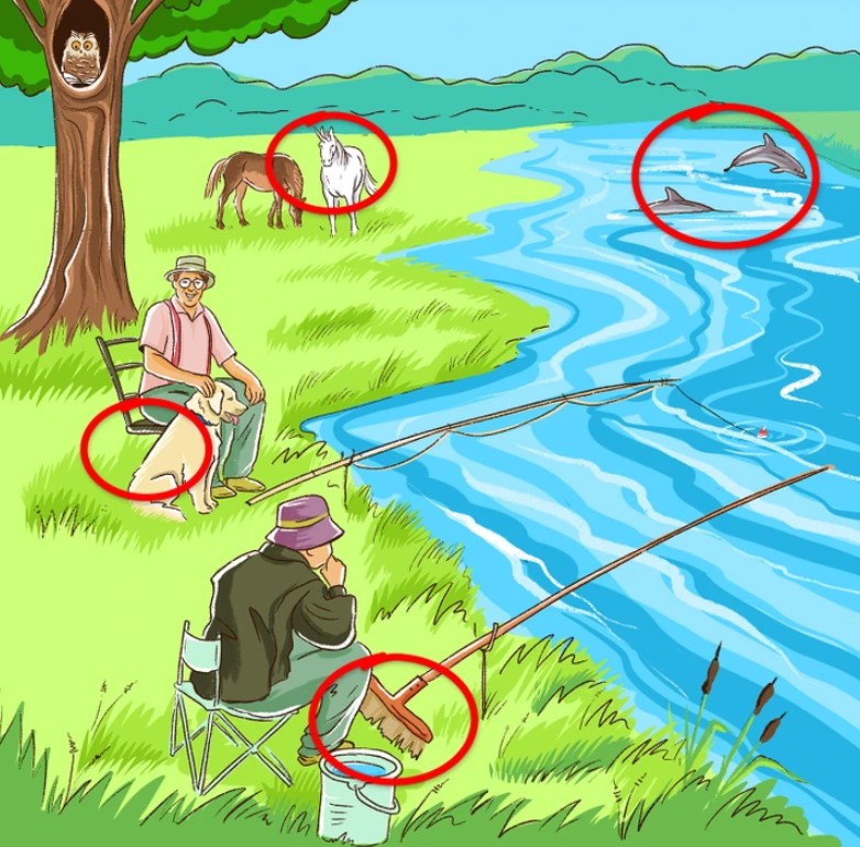 Az egyik első hiba egy mosolygó halász, aki egy olyan széken ül, amelynek legalább az egyik lába hiányzik. A folyóban úszkáló delfinek mellett a másik hiba egy egyszarvú, amely egy lóval legelészik a réten. Az utolsó ellentmondás az, hogy a lila kalapos halász valószínűleg egyetlen halat sem fogna, mivel bot helyett seprű van nála.