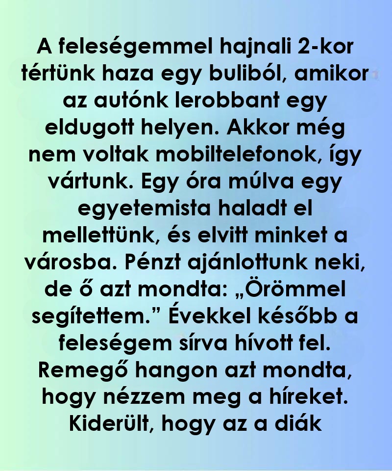 Sok éve, egy késő esti hazafelé úton lerobbant az autónk a semmi közepén. Akkor még nem volt mobiltelefonunk, nem tudtunk segítséget hívni. Ahogy kezdett eluralkodni…