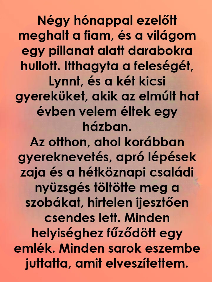 Négy hónappal ezelőtt meghalt a fiam, és a világom egy pillanat alatt darabokra hullott. Itthagyta a feleségét, Lynnt, és a két kicsi gyereküket, akik az…